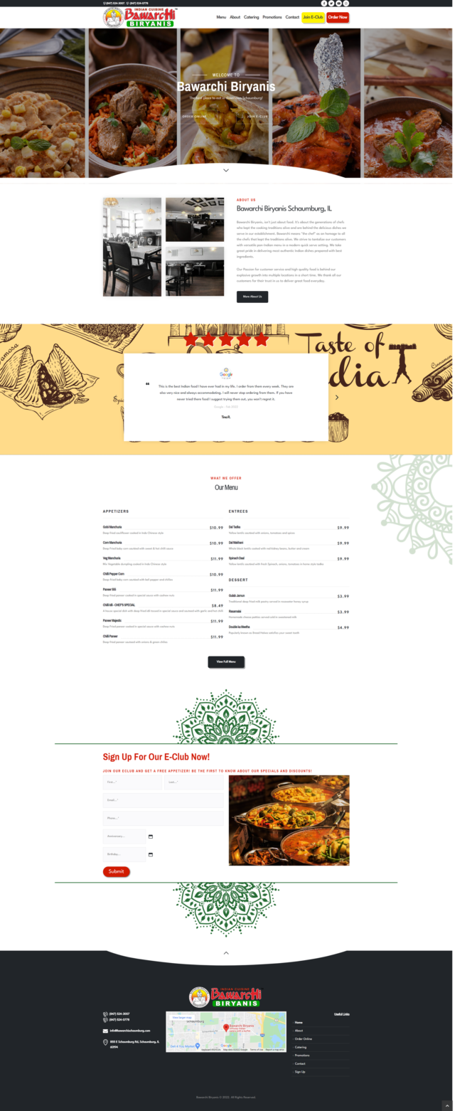 Bawarchi Biryanis Schaumburg, IL is a website that is currently still in progress. For this project I took part in the website design and development. The supplied screenshot is the progress of the new website.